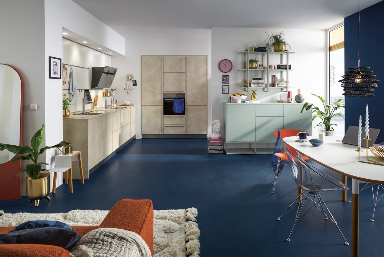 In dieser modernen Küche mit beeindruckender Insel in Betonoptik vereinen sich höchste Ansprüche an das Ambiente und das Genießen des Lebens mit den Liebsten. Die markante Betonoptik verleiht der Küche einen urbanen Charme, während intelligente Stauraumlösungen und hochwertige Geräte für Funktionalität sorgen. Hier wird das Kochen zu einem Vergnügen und das gemeinsame Beisammensein zu einem besonderen Erlebnis. Ein stilvolles und einladendes Paradies für kulinarische Freuden und kostbare Momente mit Familie und Freunden.