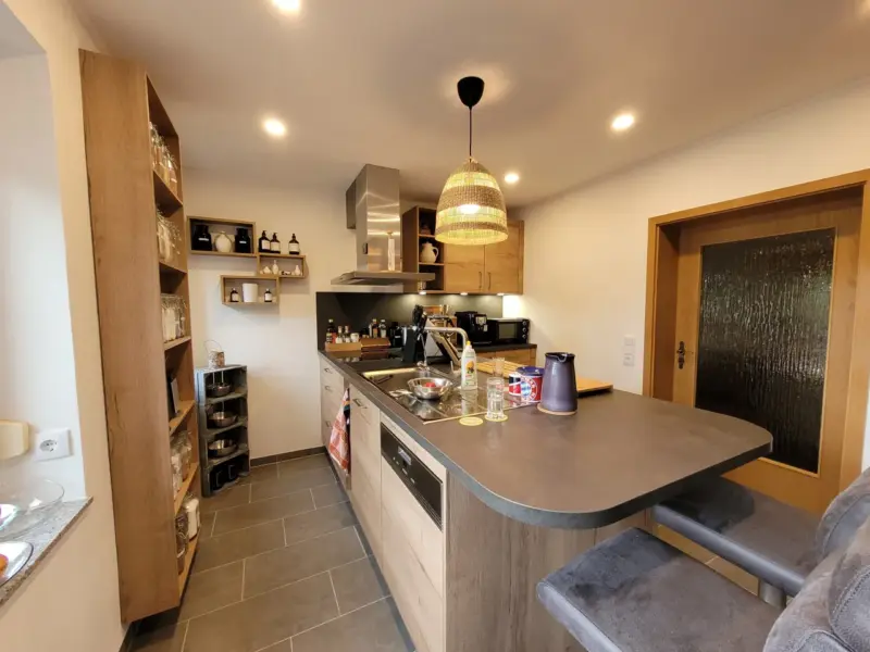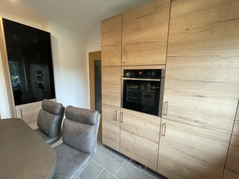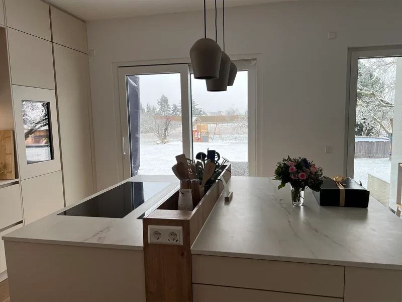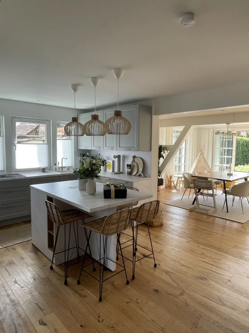 Ist der Küchenraum groß genug, kannst Du auf der Seite ohne Küchenzeile einen Esstisch aufstellen. Je nachdem, wie die Küche geschnitten ist, wird der Raum so sehr gemütlich und lädt dazu ein, nach dem Essen noch lange zusammen zu sitzen oder morgens geruhsam mit einem Kaffee in den Tag zu finden.