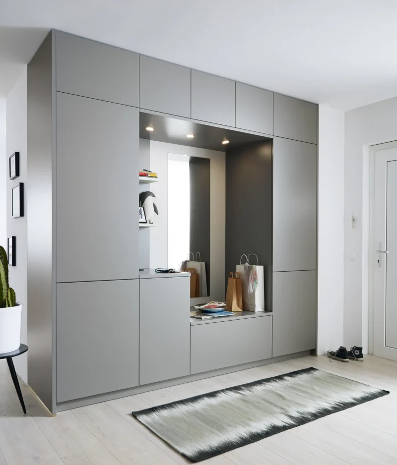 Unser Auftrag bestand darin, für den Kunden ein ganzheitliches Wohnkonzept für Küche, Hauswirtschaftsraum, Garderobe und Ankleidezimmer zu entwerfen. Im Kontrast zur Küche wünschten sie sich ein helles und modernes Design der Wohnmöbel, dass sich in allen Räumen wiederfinden sollte. Im Hauswirtschaftsraum sollten außerdem Waschmaschine und Trockner in die Schränke integriert werden, um eine ergonomische Bedienung zu ermöglichen. Im Ankleidezimmer war es wichtig, möglichst viel Platz für hängende Sachen an Kleiderbügeln bereit zu stellen.